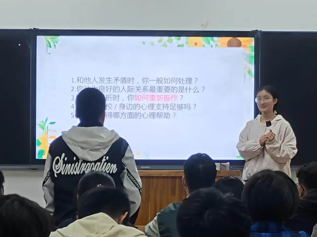 主讲同学以“大学心理健康的温暖”为开篇,结合大学生常见心理困扰,用通俗语言科普心理健康的重要性,引导同学们正确认识情绪、接纳自我。为增强互动性,现场设置心理状态自测环节,通过“近期心情、压力来源、调节能力”等贴近日常的问题,引导同学们自我审视、直面内心的情绪状态,不少同学在自测中对自己的心理状况有了更清晰的认知。随后进入互动讨论环节,围绕“矛盾处理、人际关系、挫折应对”等话题,同学们积极分享经历与感悟,在真诚交流中相互启发、彼此鼓励,现场氛围温暖热烈。