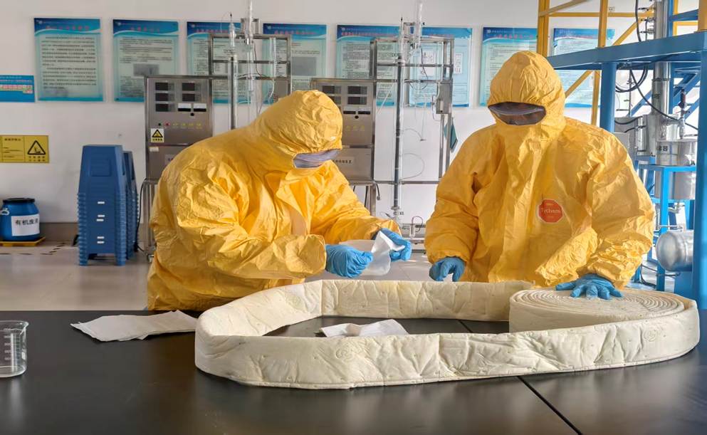 与此同时,由实验老师带领的应急处理组迅速抵达现场。他们身着防护装备,动作娴熟地设置警戒区域,使用专用器材对泄漏废液进行快速、规范、安全的吸附与清理,完整演示从事故上报、现场控制到废物回收的闭环处置流程。